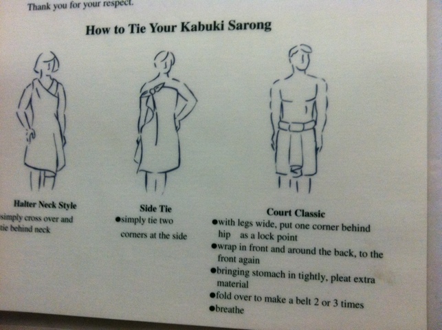 Kabuki Springs (the Japanese baths in San Francisco is apparently worried that its male customers will feel insecure in their masculinity if they are expected to wear the same garment as the women who come there. So to compensate, Kabuki offers the male-sounding title of “Court Classic.” Humorous directions for achieving this style include such masculinity-affirming suggestions as “spread your legs wide” and “breathe.”