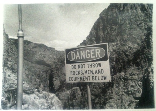 Constructing a damn dam. The Hoover? No context for this strange sign. Was throwing workers into the ravine a real issue? Collection of Gay Highwaymen.