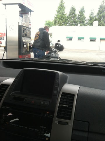 Biker dude (with Masonic Bikers colors), filling up at a gas station on Sunday morning in Redding, CA.
