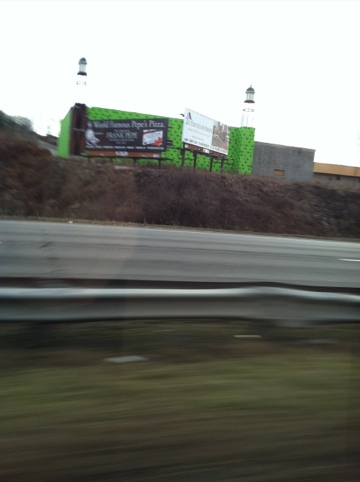 Just drove by an interesting construction project in Waterbury, CT: a mosque (the walls are blanketed in a particularly loud shade of green plastic sheets), partially obscured by pizza and furniture billboards.