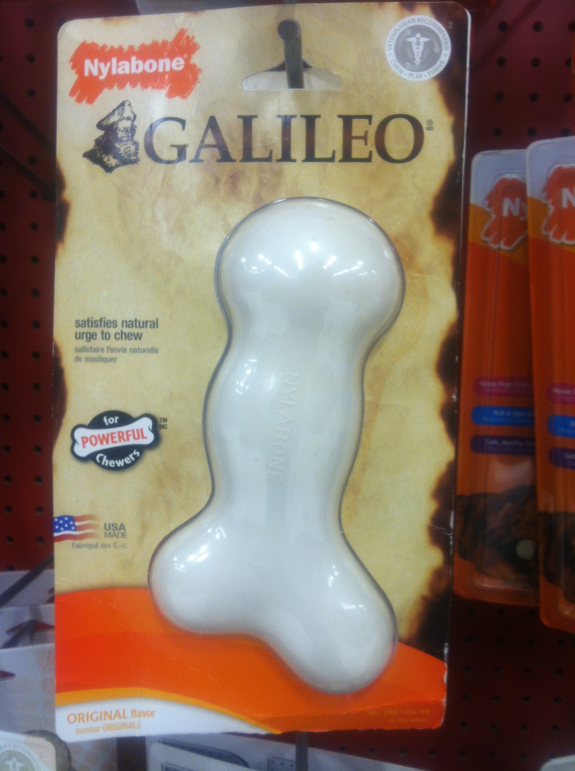 The Nylabone Galileo. For powerful chewers. Satisfies the natural urge to chew. That’s what it says. Right there on the label. Sight seen at Petsco…where the pets go. Put this bone in his mouth. Woof!
