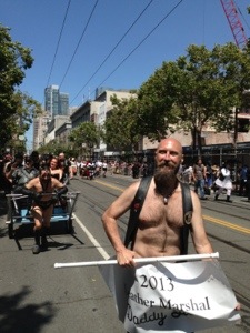 SF Leather Marshall Steve Gaynes drawn by human pony cart up Market Street in San Francisco. Very kinky! That’s his boy, Rob, holding the banner and his female cohort Luna sharing the cart. Men of the 15 are bringing up the rear. It was a long, hot, trot…