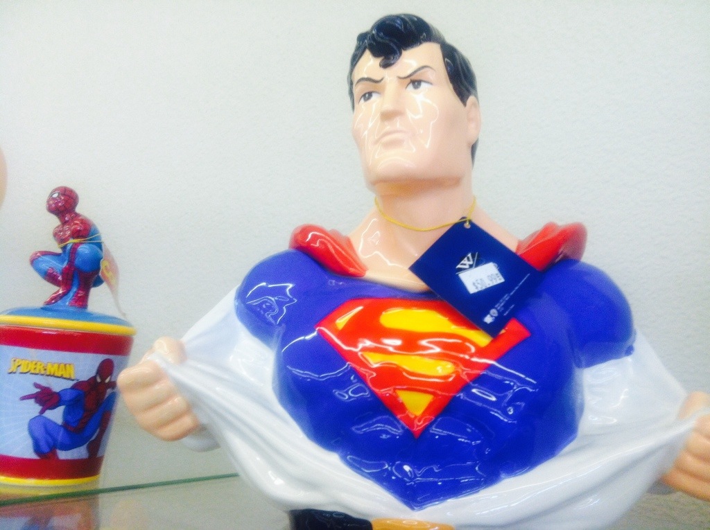 Spider-Man and Superman: They do whatever super-spider shelf men can! Sight seen in a truck stop gift shop. For a strange mid-century Japanese Batman who takes it up the butt, click here.