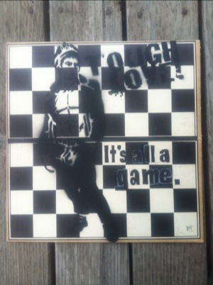 Cool pink t-Rex. Artist unknown. Drawing on map. In a Chronicle box. I think this is the same artist who did the yellow Dr. Seuss fish in the next medley.