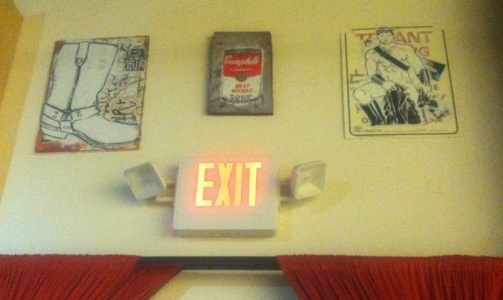 Novy’s cool take-off of a Warhol soup can is on display with a lot of his other stencil work at Tough Love. They are scattered throughout the show here and there: a nod to the furtive nature of street art. And these three are installed over the Exit sign…another Art World in-joke for those who know why museums always make visitors…exit through the gift shop!